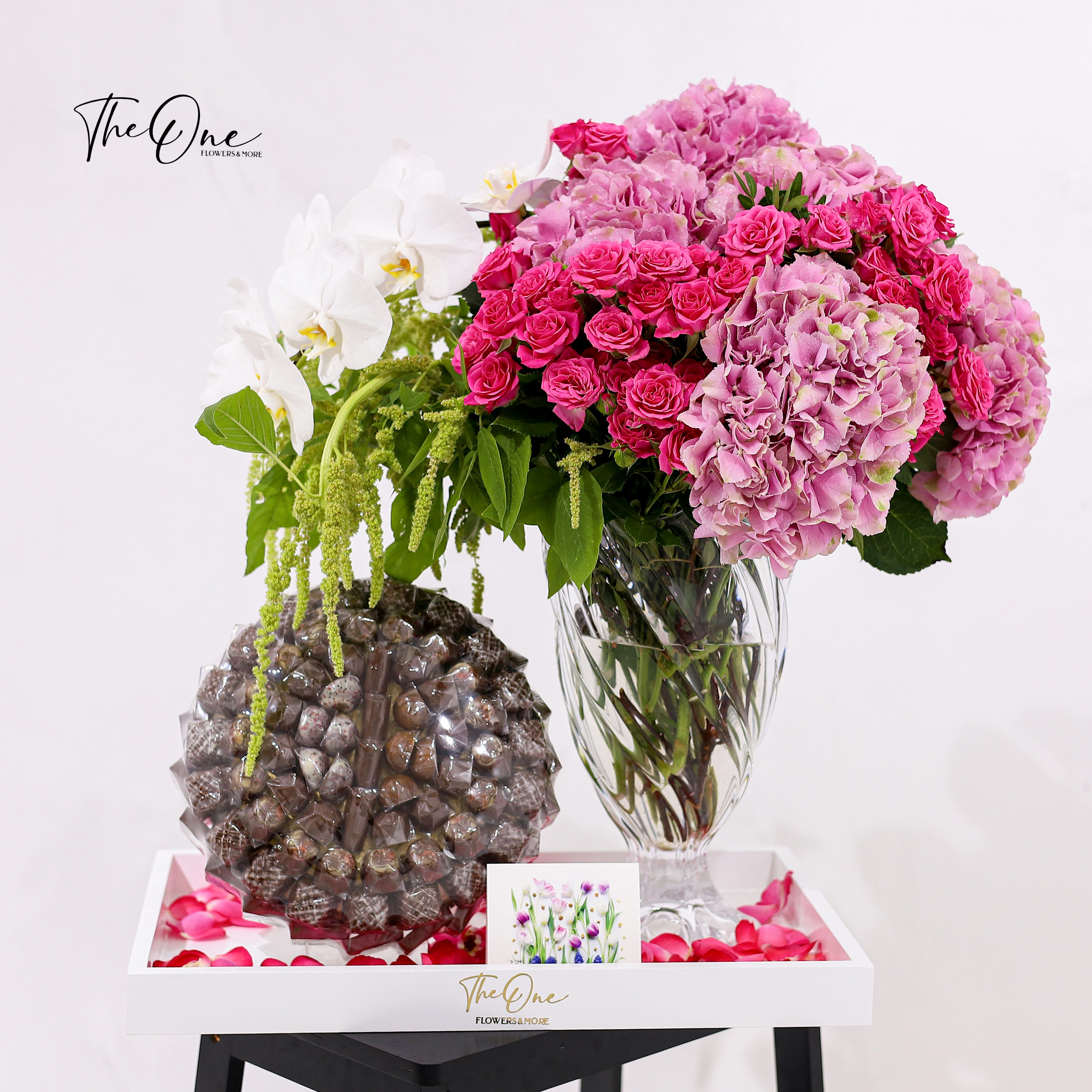 Our Hydrangea Love & Choco creation is an exquisite blend of beauty and flavor, a truly special gift. Enjoy a long-lasting hydrangea flower in a luxurious array of colors, paired with sumptuous chocolate. The perfect way to show your love.