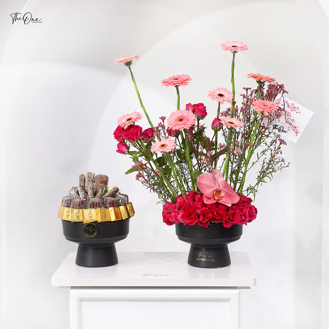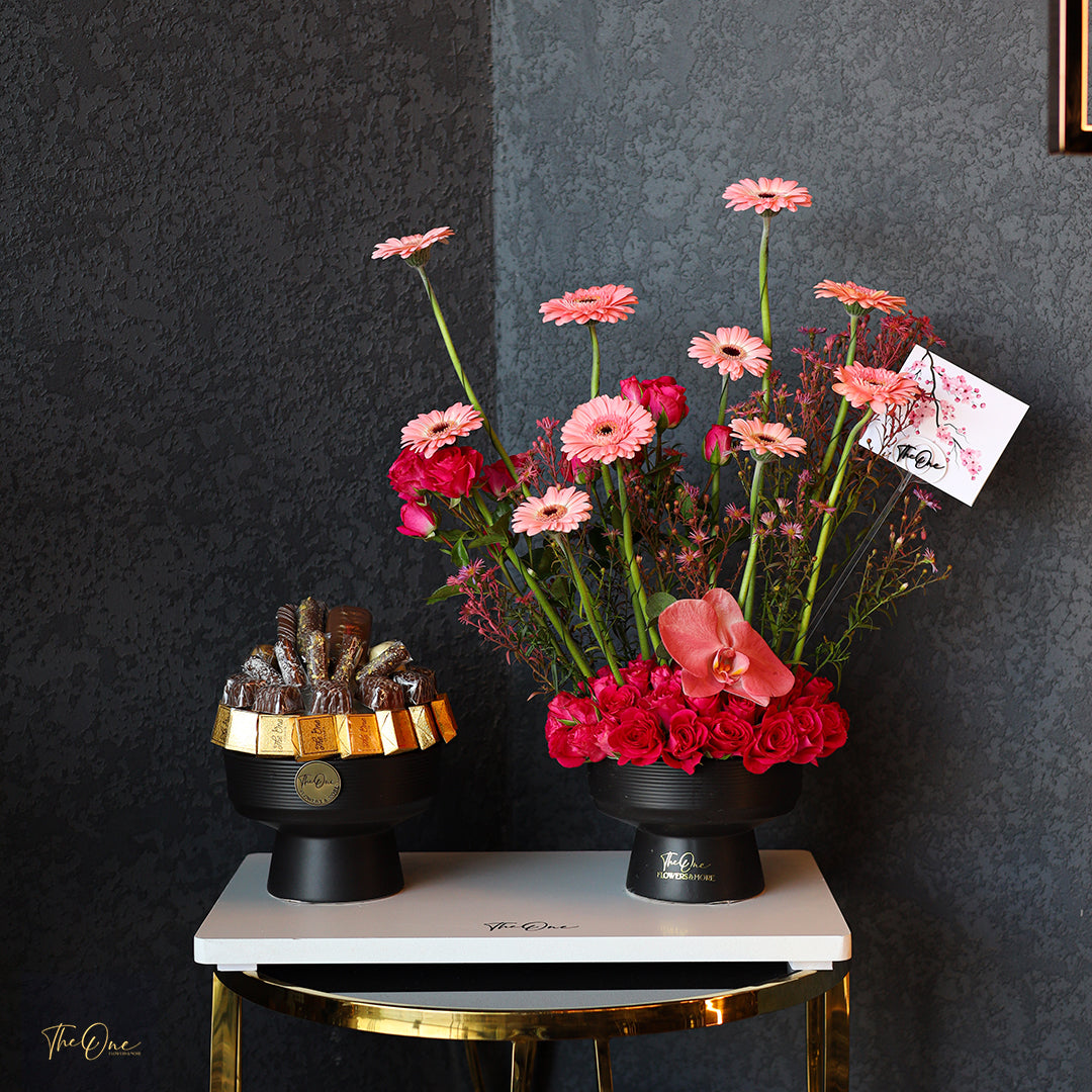 Indulge in a luxurious experience with our Flowers & Chocolate set. Delight your senses with the exquisite scent and vibrant colors of fresh flowers, while savoring the rich and decadent taste of premium chocolate. Elevate your gift-giving and treat yourself or your loved ones to this sophisticated and exclusive pairing.