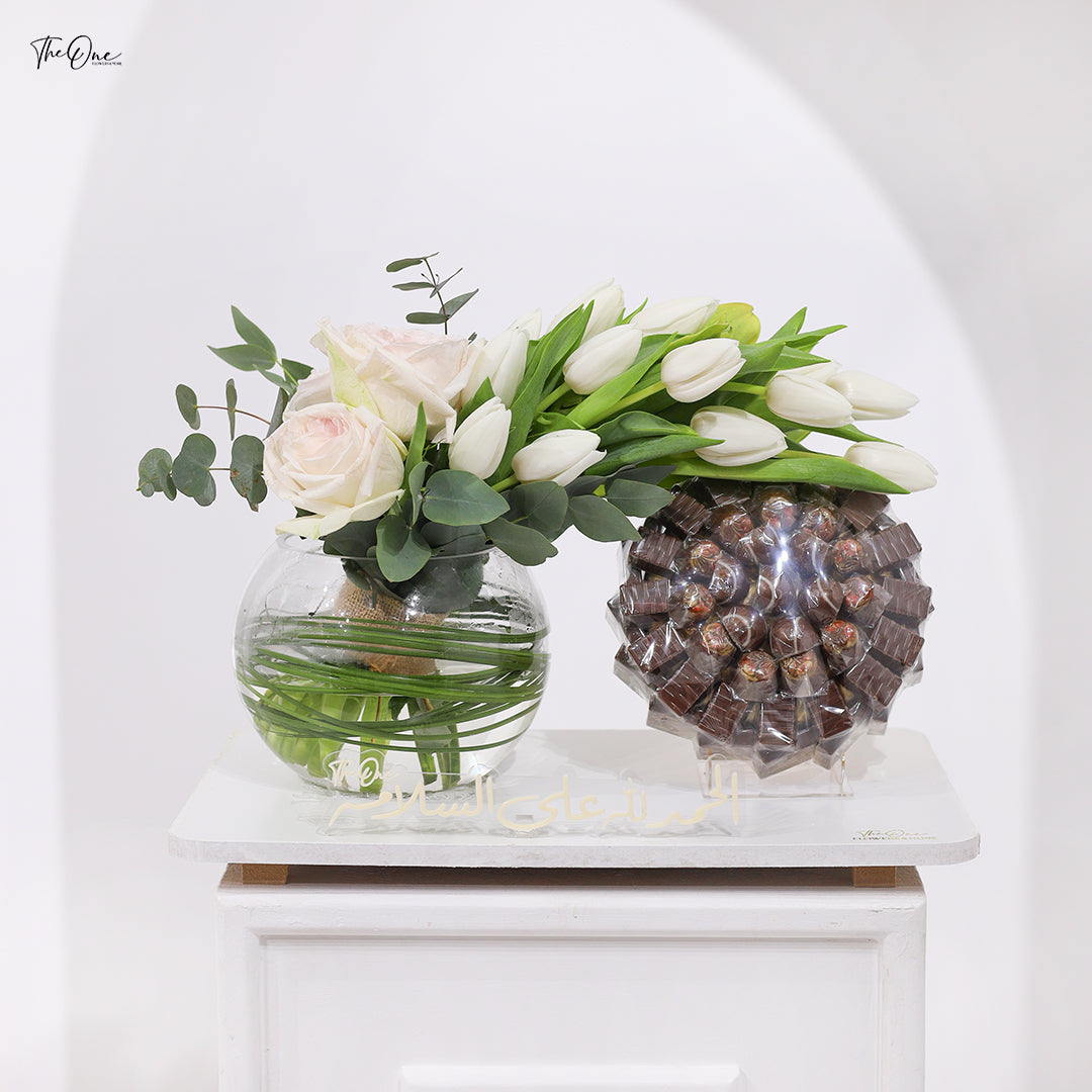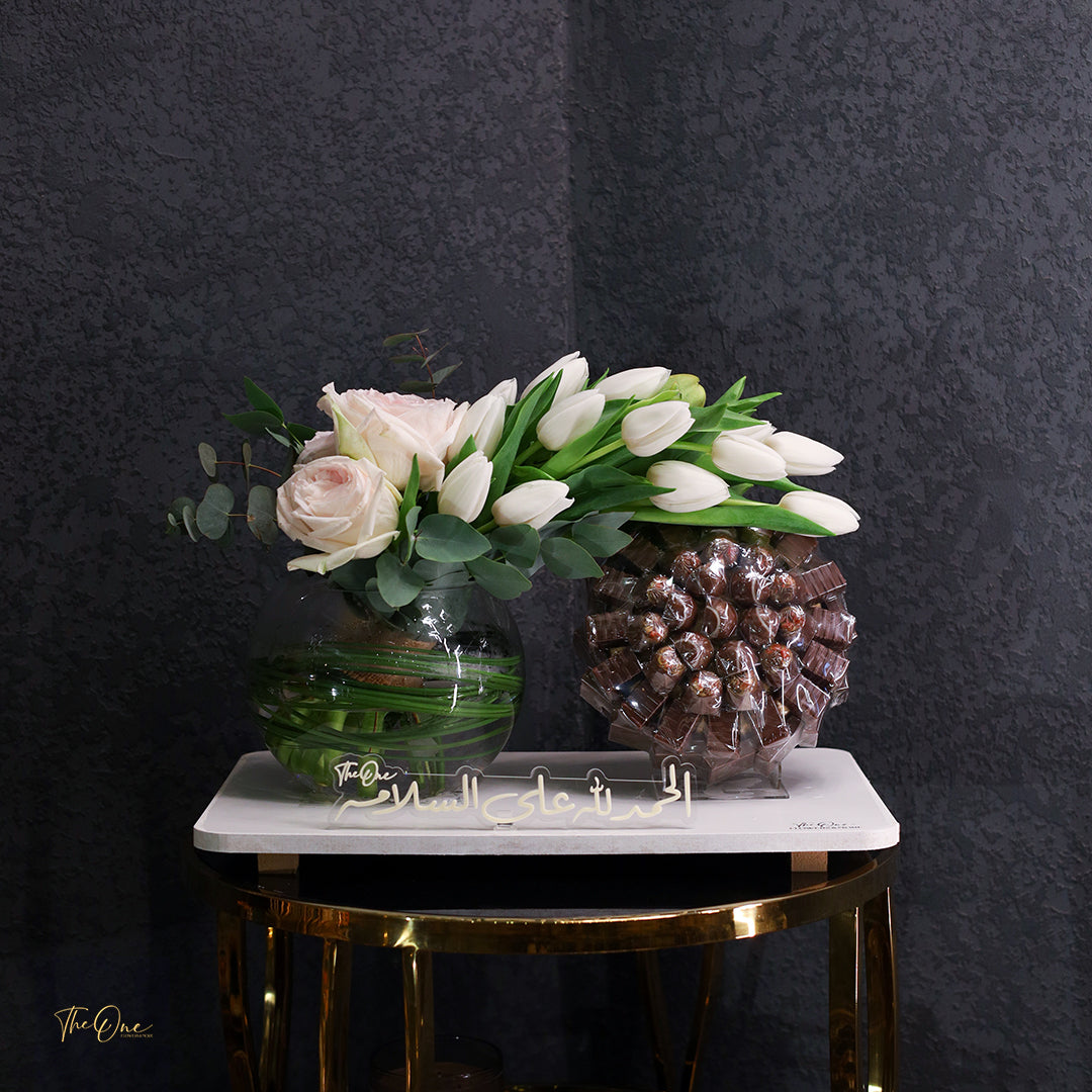 Indulge in the perfect combination of beauty and sweetness with our Flowers & Chocolate gift set. Delicate flowers and delectable chocolates come together to create a luxurious and exclusive experience. Elevate any occasion with this elegant and tasteful gift, perfect for the discerning individual.