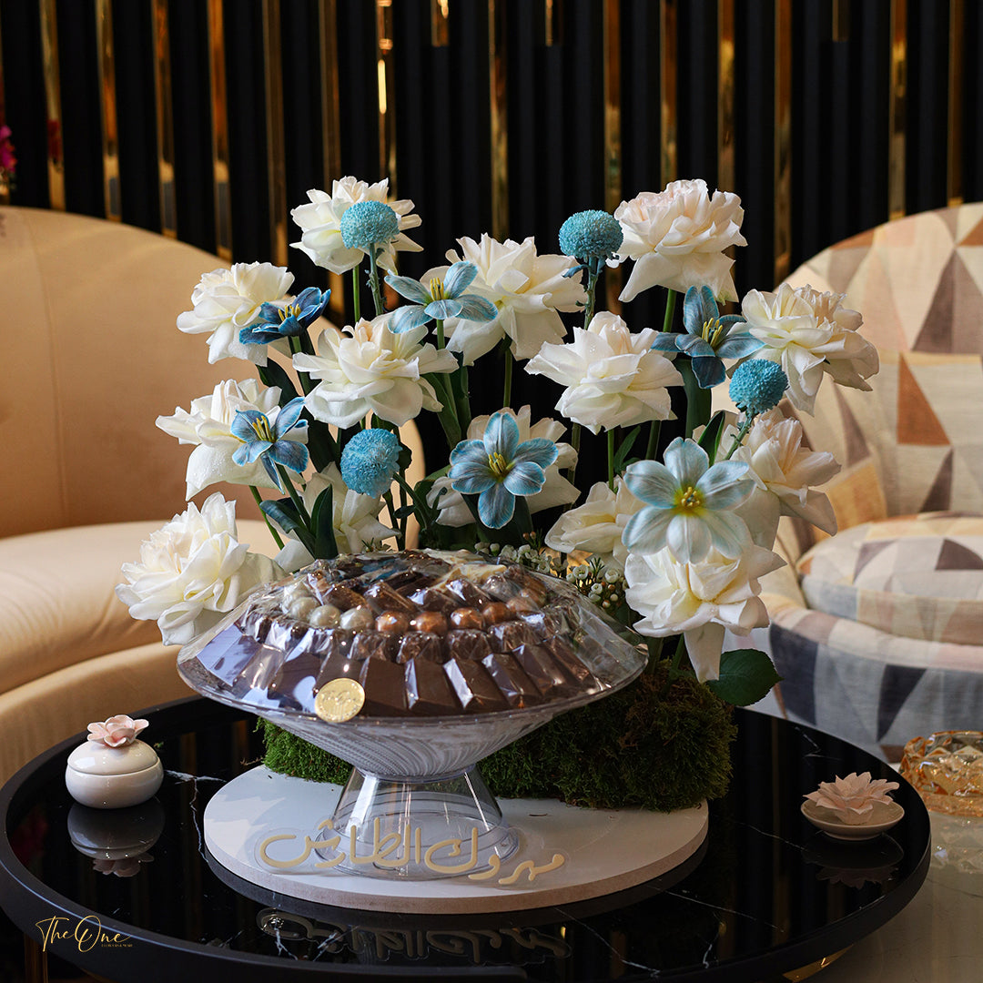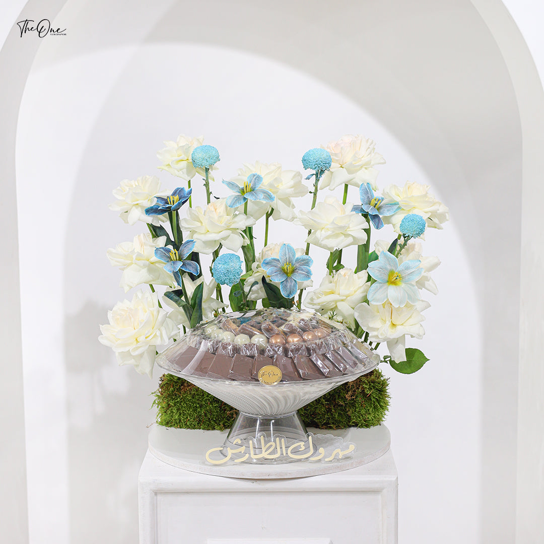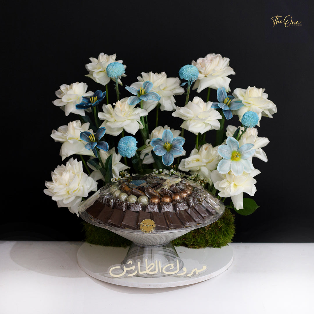 Indulge in perfection with this exquisite package of flowers and chocolate. Elevate your senses with the delicate petals of fresh flowers and the rich, decadent taste of premium chocolate. The perfect combination for a luxurious and sophisticated gift.
