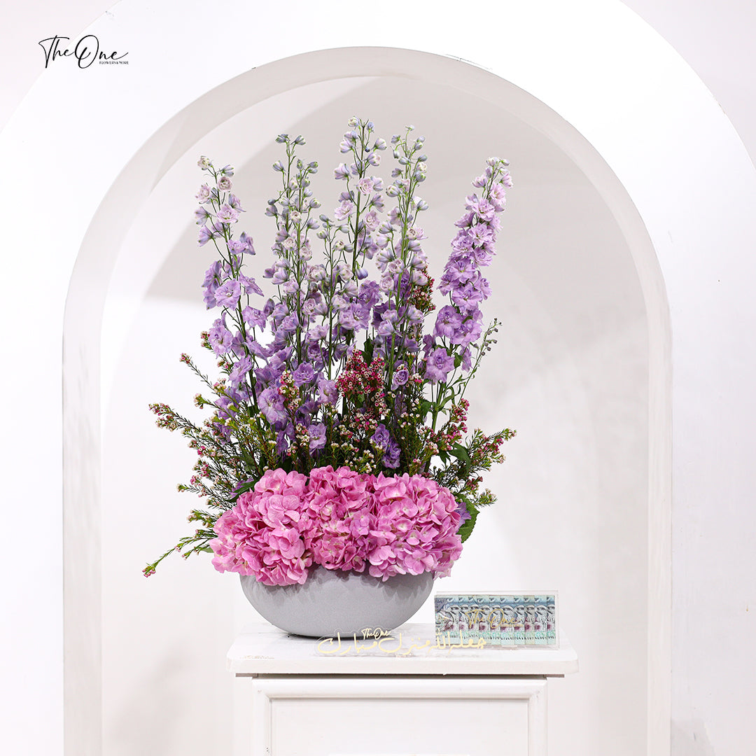 Experience the beauty of nature with this exquisite bouquet of pink and purple flowers. Exuding elegance and sophistication, these delicate blooms will bring a sense of luxury to any home.